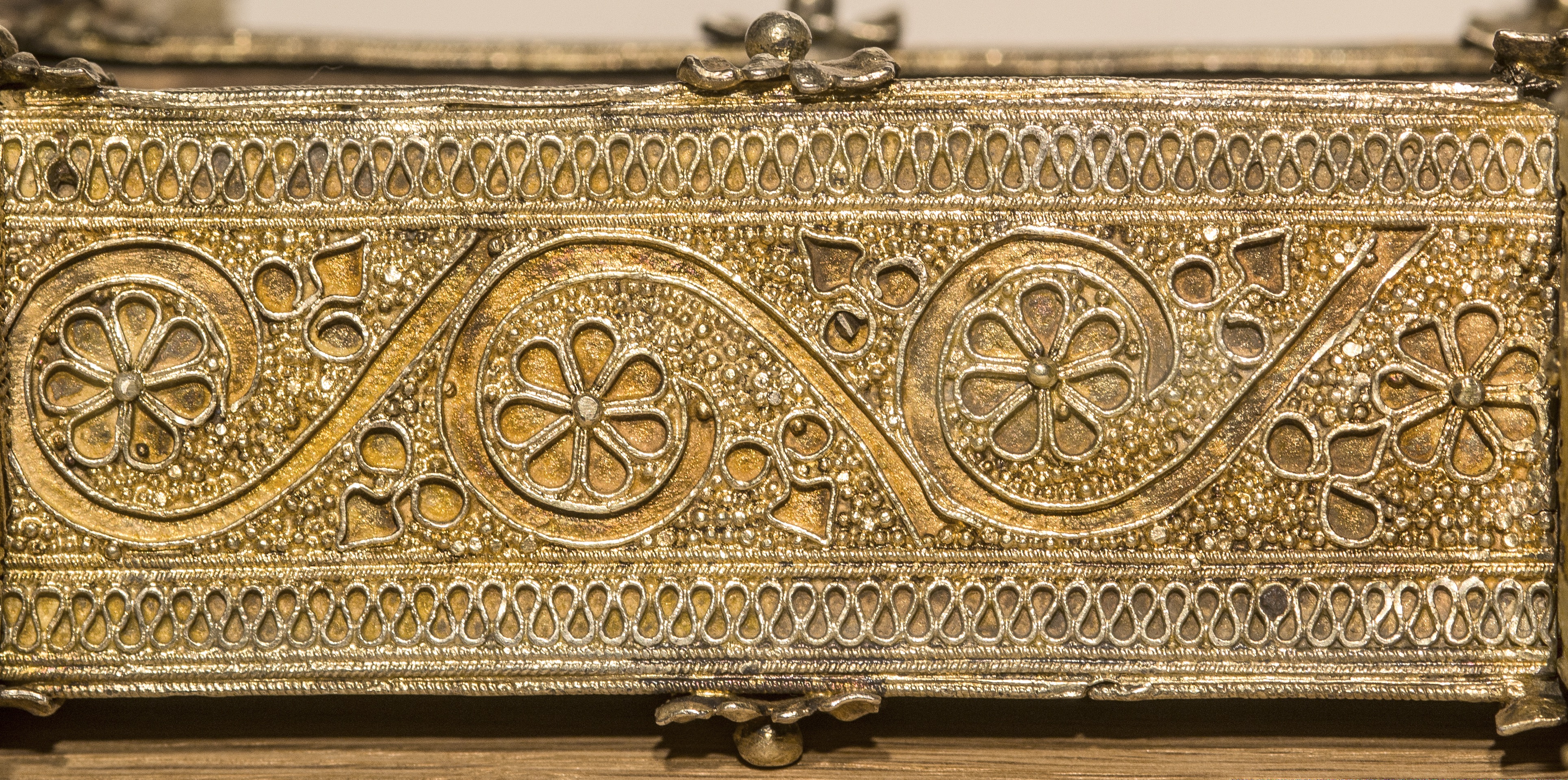 The double-sided 50 cm-high cross has three arms, symbolic of the Crucifixion cross, whose upper arm contained the inscription Jesus of Nazareth, King of the Jews, and the small lower arm supported His nailed feet. The cross is carved in low relief on both sides and has a silver-mount decorated with filigree spiral vegetal motifs fixed at corners with rosettes. The sphere in the silver handle symbolizes the globe.