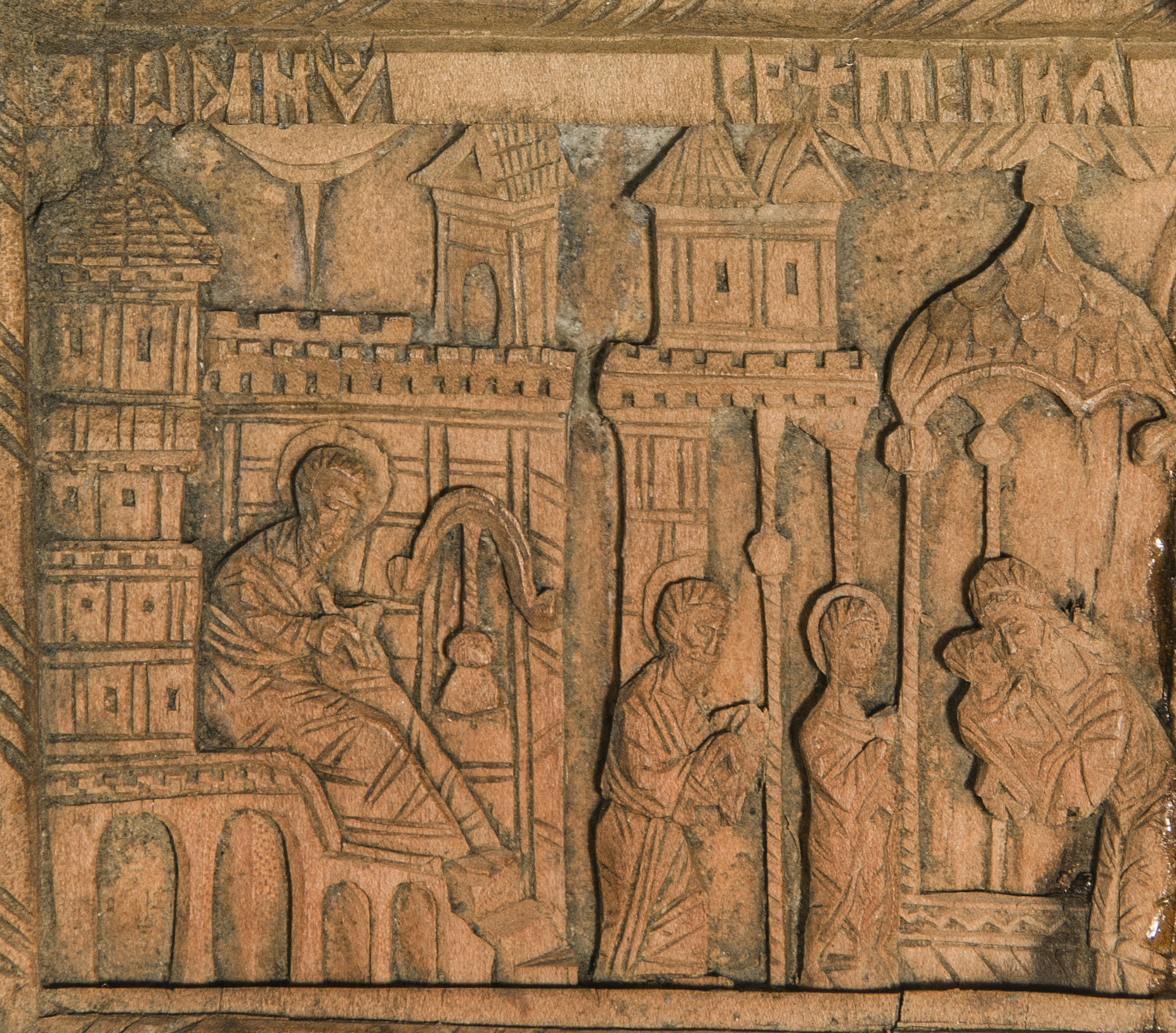 Each side of the cross contains 16 miniature scenes which recount Jesus’ life and Passions. These are supplemented by several scenes representing local legends which anchor the cross in 16th century Moldavian religious practice. Most scenes are set in or against a complex architectural background while several others are set in ample, suggestive landscapes. Both architecture and landscape strengthen and support the rich narrative while allowing the artist to convincingly conflate certain episodes.